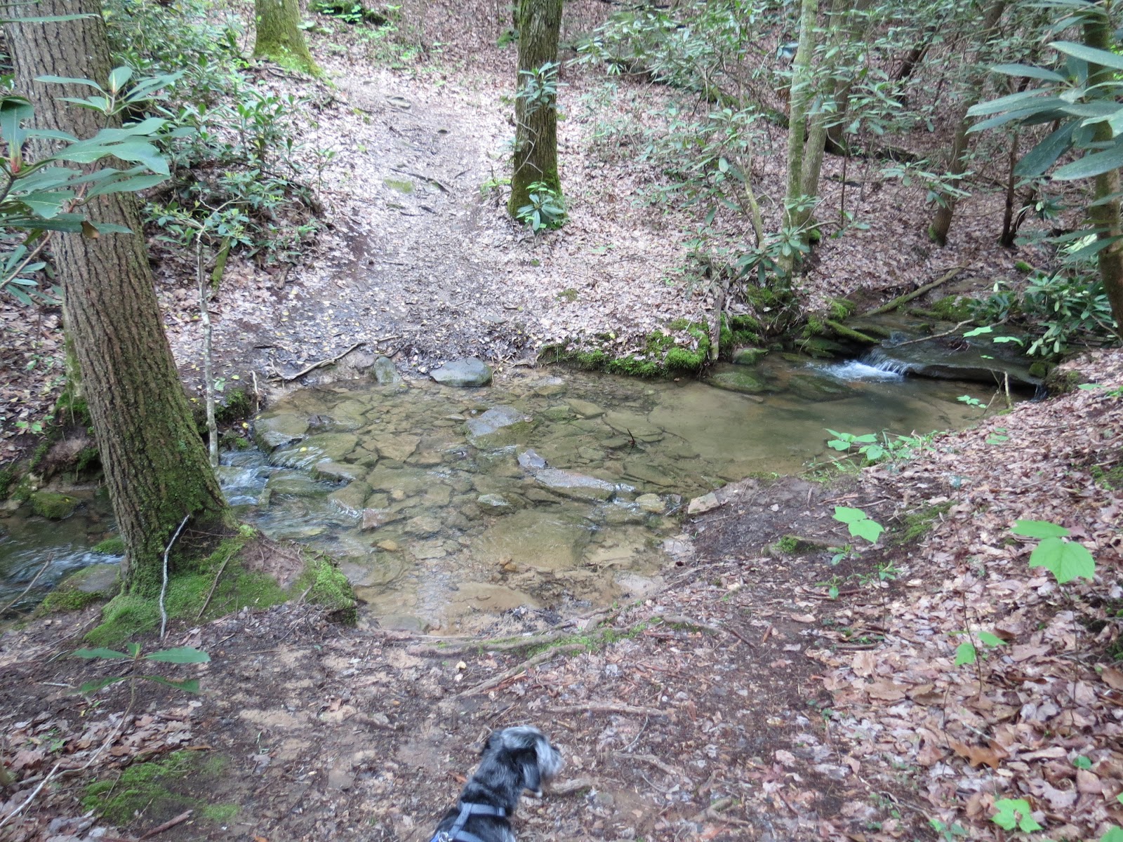 I decided that the best way to ford this stream on the stepping stones was to go first and have Thistle follow. So I lined him up behind me. That plan worked well until I took my first step to the stone in the middle which wobbled. Thistle took that as his signal to leap, landing in the stream and up the other side. Fortunately I've been doing my Wii balance exercises and was able to regain my balance. Only Thistle got wet. On the way back I let him go first.
